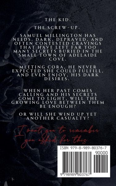 "I want you to remember you asked for this." The kid. The screw-up. Samuel Millington has needs. Dark, depraved and often contested cravings that have left far too many secrets buried in the small town of Adelaide Cove. Meeting Cora, he never expected she could fulfill, and even enjoy, his dark desires. When her past comes calling and his secrets come to light, will the growing love between them be enough? Or will she wind up yet another casualty?