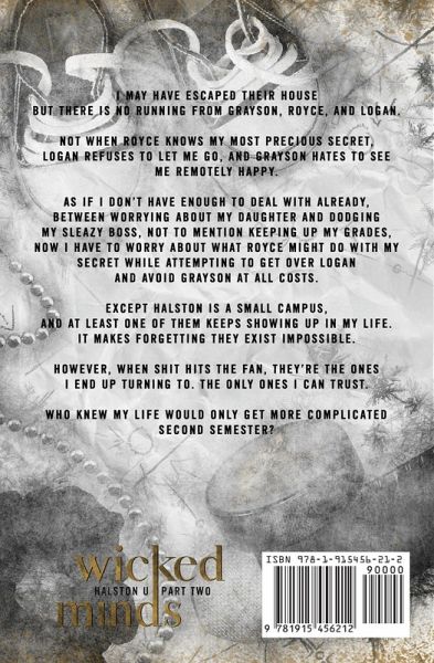 I may have escaped their house but there is no running from Grayson, Royce, and Logan. Not when Royce knows my most precious secret, Logan refuses to let me go, and Grayson hates to see me remotely happy. As if I don't have enough to deal with already, between worrying about my daughter and dodging my sleazy boss, not to mention keeping up my grades, now I have to worry about what Royce might do with my secret while attempting to get over Logan and avoid Grayson at all costs. Except Halston is a small campus, and at least one of them keeps showing up in my life. It makes forgetting they exist impossible. However, when shit hits the fan, they're the ones I end up turning to. The only ones I can trust. Who knew my life would only get more complicated second semester? ***Wicked Minds is the second book in the Halston U series and contains dark themes. Please check the front of the book for trigger warnings. It is highly recommended that you read the first book in this trilogy, Frozen Hearts, before starting into this one.