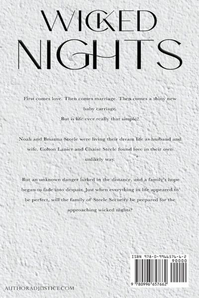 First comes love. Then comes marriage. Then comes a shiny new baby carriage. But is life ever really that simple? Noah and Brianna Steele were living their dream life as husband and wife. The wicked games of the past were behind them, and every day was better than the last. Hopes and dreams, once only fantasies, were, at last, their reality. Colton Lanier and Chaise Steele found love in their own unlikely way. During their whirlwind romance, they broke the wicked ties that bound them and formed new, unbreakable bonds of love. After they mended relationships with estranged family members, life seemed to give them a new chance for happiness. But an unknown danger lurked in the distance, and a family’s hope began to fade into despair. Just when everything in life appeared to be perfect, will the family of Steele Security be prepared for the approaching wicked nights?