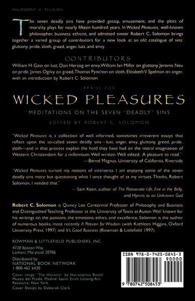 The seven deadly sins have provided gossip, amusement, and the plots of morality plays for nearly fifteen hundred years. In Wicked Pleasures, well-known philosopher, business ethicist, and admitted sinner Robert C. Solomon brings together a varied group of contributors for a new look at the old catalogue of sins. Solomon introduces the sins as a group, noting their popularity and pervasiveness. From the formation of the canon by Pope Gregory the Great, the seven have survived the sermonizing of the Reformation, the Inquisition, the Enlightenment, the brief French reign of supreme reason, the apotheoses of capitalism, communism, secular humanism and postmodernism, the writings of numerous rabbis and evangelical moralists, two series in the New York Times, and several bad movies. Taking their cue from this remarkable history, the contributors, including Thomas Pynchon, allowed one sin apiece, provide a non-sermonizing and relatively light-hearted romp through the domain of the deadly seven.