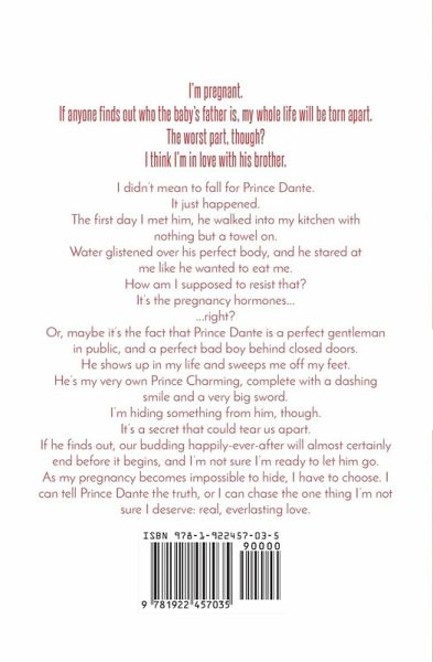 I'm pregnant. If anyone finds out who the baby's father is, my whole life will be torn apart. The worst part, though? I think I'm in love with his brother. I didn't mean to fall for Prince Dante. It just happened. The first day I met him, he walked into my kitchen with nothing but a towel on. Water glistened over his perfect body, and he stared at me like he wanted to eat me. How am I supposed to resist that? It's the pregnancy hormones... ...right? Or, maybe it's the fact that Prince Dante is a perfect gentleman in public, and a perfect bad boy behind closed doors. He shows up in my life and sweeps me off my feet. He's my very own Prince Charming, complete with a dashing smile and a very big sword. I'm hiding something from him, though. It's a secret that could tear us apart. If he finds out, our budding happily-ever-after will almost certainly end before it begins, and I'm not sure I'm ready to let him go. As my pregnancy becomes impossible to hide, I have to choose. I can tell Prince Dante the truth, or I can chase the one thing I'm not sure I deserve: real, everlasting love.