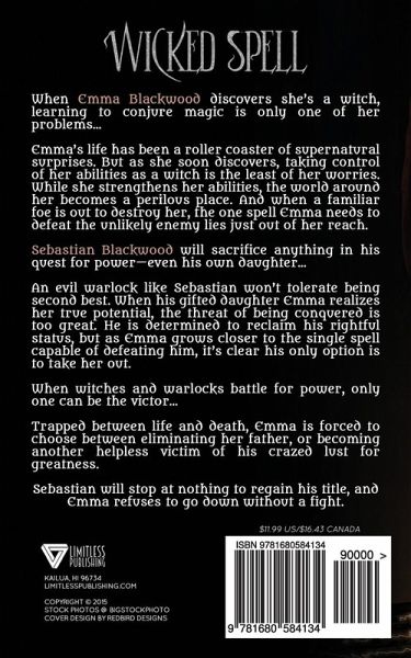 When Emma Blackwood discovers she's a witch, learning to conjure magic is only one of her problems... Emma's life has been a roller coaster of supernatural surprises. But as she soon discovers, taking control of her abilities as a witch is the least of her worries. While she strengthens her abilities, the world around her becomes a perilous place. And when a familiar foe is out to destroy her, the one spell Emma needs to defeat the unlikely enemy lies just out of her reach. Sebastian Blackwood will sacrifice anything in his quest for power-even his own daughter... An evil warlock like Sebastian won't tolerate being second best. When his gifted daughter Emma realizes her true potential, the threat of being conquered is too great. He is determined to reclaim his rightful status, but as Emma grows closer to the single spell capable of defeating him, it's clear his only option is to take her out. When witches and warlocks battle for power, only one can be the victor... Trapped between life and death, Emma is forced to choose between eliminating her father, or becoming another helpless victim of his crazed lust for greatness. Sebastian will stop at nothing to regain his title, and Emma refuses to go down without a fight.