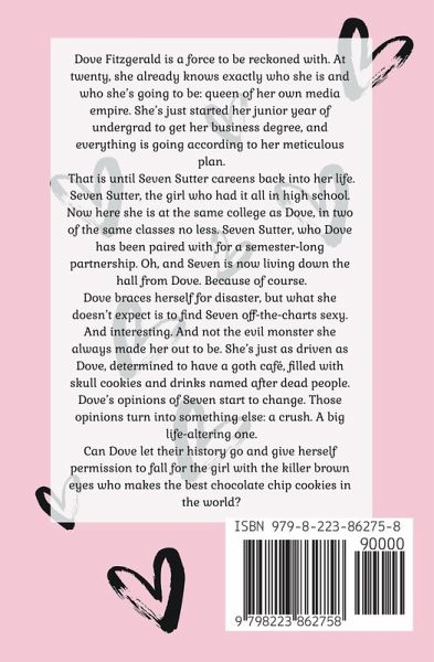 Dove Fitzgerald is a force to be reckoned with. At twenty, she already knows exactly who she is and who she's going to be: queen of her own media empire. She's just started her junior year of undergrad to get her business degree, and everything is going according to her meticulous plan. That is until Seven Sutter careens back into her life. Seven Sutter, the girl who had it all in high school. Now here she is at the same college as Dove, in two of the same classes no less. Seven Sutter, who Dove has been paired with for a semester-long partnership. Oh, and Seven is now living down the hall from Dove. Because of course. Dove braces herself for disaster, but what she doesn't expect is to find Seven off-the-charts sexy. And interesting. And not the evil monster she always made her out to be. She's just as driven as Dove, determined to have a goth café, filled with skull cookies and drinks named after dead people. Dove's opinions of Seven start to change. Those opinions turn into something else: a crush. A big life-altering one. Can Dove let their history go and give herself permission to fall for the girl with the killer brown eyes who makes the best chocolate chip cookies in the world?