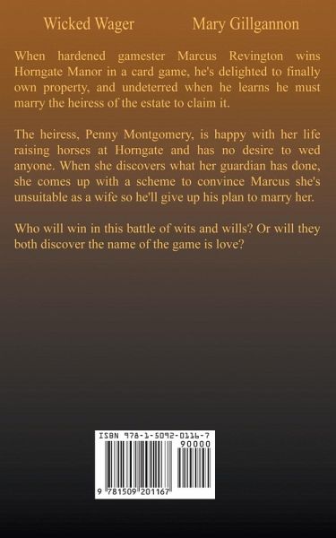 When hardened gamester Marcus Revington wins Horngate Manor in a card game, he's delighted to finally own property, and undeterred when he learns he must marry the heiress of the estate to claim it. The heiress, Penny Montgomery, is happy with her life raising horses at Horngate and has no desire to wed anyone. When she discovers what her guardian has done, she comes up with a scheme to convince Marcus she's unsuitable as a wife so he'll give up his plan to marry her. Who will win in this battle of wits and wills? Or will they both discover the name of the game is love?
