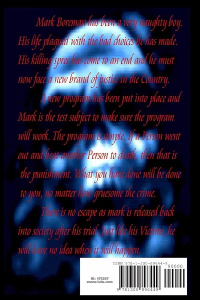 Mark Boreman has been a very naughty boy. His life plagued with the bad choices he has made. His killing spree has come to an end and he must now face a new brand of justice in the country. A new program has been put into place and Mark is the test subject to make sure the program will work. The program is simple. If a person went out and beat another person to death then that is the punishment. What you have done is what will be done to you. There is no escape as he is released back into society after his trial. Just like his victims he will have no idea when it will happen.