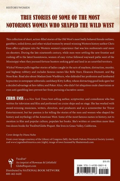 This collection of short, action-filled stories of the Old West’s most egregiously badly behaved female outlaws, gamblers, soiled doves, and other wicked women by award-winning Western history author Chris Enss offers a glimpse into Western Women’s experience that's less sunbonnets and more six-shooters. Pulling together stories of ladies caught in the acts of mayhem, distraction, murder, and highway robbery, it will include famous names like Belle Starr and Big Nose Kate, as well as lesser known characters.