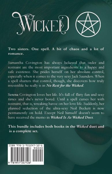 Two sisters. One spell. A bit of chaos and a lot of romance. Samantha Covington has always believed that order and restraint are the most important ingredients to a happy and safe existence. She prides herself on her absolute control, especially when it comes to the very sexy Jack Saunders. When a spell shatters that control, though, she discovers how truly irresistible he really is in No Rest for the Wicked. Serena Covington loves her life. It's full of flirty fun and sexy times and she's never bored. Until a spell curses her with restraint, that is, wreaking havoc on her love life. Suddenly, her planned seduction of the ultra-sexy Neil Beckett is now permanently on hold. Except Neil himself doesn't seem to have received the memo in Wicked Is As Wicked Does. This bundle includes both books in the Wicked duet and is a complete set.