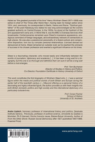 Hailed as «the greatest journalist of his time» Henry Wickham Steed (1871-1956) was editor-in-chief of The Times after World War I, having been its foreign editor since 1914, and, previously, its correspondent in Berlin, Vienna and Rome. «Spiritual godfather» of the post-Habsburg new states he was long acknowledged as the world's greatest authority on Central Europe. In the 1930s, he stood at the forefront of the anti-appeasement camp and, in World War II, was the BBC's Overseas Services chief broadcaster. Contemporaries remarked upon Steed's impressive appearance, prodigious command of foreign languages, and extraordinary network of connections in high places. He was also a paradoxical personality of a liberal outlook and conservative disposition, torn too by complex personal relationships. Lionized abroad but denounced at home, Steed remained an outsider even as he reached the pinnacle of success in his chosen profession and exerted a significant influence on his times.