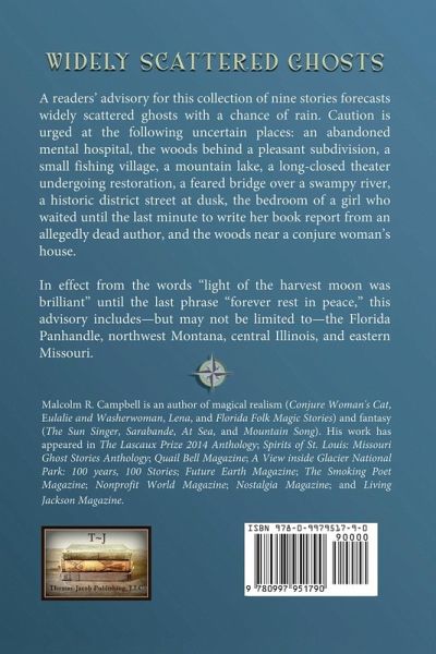 A readers’ advisory for this collection of nine stories forecasts widely scattered ghosts with a chance of rain. Caution is urged at the following uncertain places: an abandoned mental hospital, the woods behind a pleasant subdivision, a small fishing village, a mountain lake, a long-closed theater undergoing restoration, a feared bridge over a swampy river, a historic district street at dusk, the bedroom of a girl who waited until the last minute to write her book report from an allegedly dead author, and the woods near a conjure woman’s house. In effect from the words "light of the harvest moon was brilliant" until the last phrase "forever rest in peace," this advisory includes—but may not be limited to—the Florida Panhandle, northwest Montana, central Illinois, and eastern Missouri.