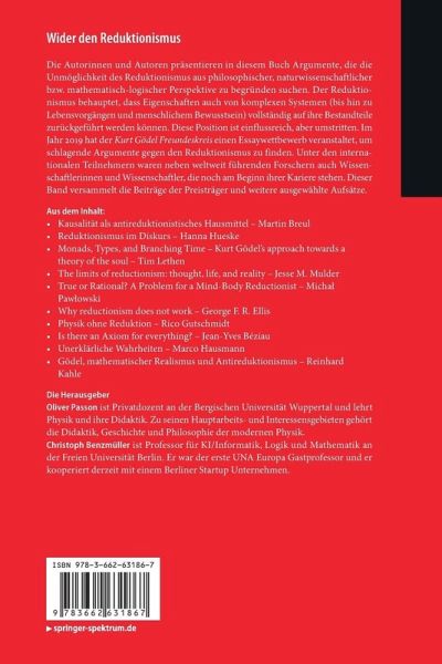 Die Autorinnen und Autoren präsentieren in diesem Buch Argumente, die die Unmöglichkeit des Reduktionismus aus philosophischer, naturwissenschaftlicher bzw. mathematisch-logischer Perspektive zu begründen suchen. Der Reduktionismus behauptet, dass Eigenschaften auch von komplexen Systemen (bis hin zu Lebensvorgängen und menschlichem Bewusstsein) vollständig auf ihre Bestandteile zurückgeführt werden können. Diese Position ist einflussreich, aber umstritten. Im Jahr 2019 hat der Kurt Gödel Freundeskreis einen Essaywettbewerb veranstaltet, um schlagende Argumente gegen den Reduktionismus zu finden. Unter den internationalen Teilnehmern waren neben weltweit führenden Forschern auch Wissenschaftler, die noch am Beginn ihrer Kariere stehen. Dieser Band versammelt die Beiträge der Preisträger und weitere ausgewählte Aufsätze.
