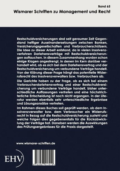 Restschuldversicherungen sind seit geraumer Zeit Gegenstand heftiger Auseinandersetzungen zwischen Banken, Versicherungsgesellschaften und Verbraucherschützern. Die Idee zu dieser Arbeit entstand, da in vielen Insolvenzverfahren Darlehensverträge mit Restschuldversicherungen auftauchen. In diesem Zusammenhang wurden schon einige Klagen angestrengt, in denen im Kern darüber verhandelt wird, ob es sich bei dem Darlehensvertrag und der Restschuldversicherung um verbundene Verträge handelt. Von der Klärung dieser Frage hängt das potentielle Widerrufsrecht des Insolvenzverwalters bzw. Verbrauchers ab. Die Gerichte haben zu der Frage, ob es sich bei einem Verbraucherdarlehensvertrag und einer Restschuldversicherung um verbundene Verträge handelt, bisher unterschiedliche Auffassungen vertreten und eine höchstrichterliche Entscheidung ist noch nicht ergangen. In der Literatur werden ebenfalls sehr unterschiedliche Ergebnisse und Lösungsansätze vertreten. Im Rahmen dieses Buches soll geprüft werden, ob dem Insolvenzverwalter bzw. dem Verbraucher ein Widerrufsrecht in Bezug auf die Restschuldversicherung zusteht und welche Folgen dies gegebenenfalls für die Rückabwicklung der Verträge hat. Daneben werden die Auswirkungen des Prüfungsergebnisses für die Praxis dargestellt.