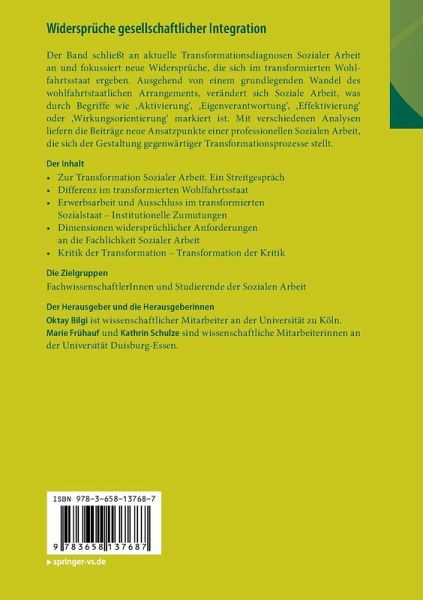 Der Band schließt an aktuelle Transformationsdiagnosen Sozialer Arbeit an und fokussiert auf neue Widersprüche, die sich im transformierten Wohlfahrtsstaat ergeben. Ausgehend von einem grundlegenden Wandel des wohlfahrtstaatlichen Arrangements, verändert sich Soziale Arbeit, was durch Begriffe wie 'Aktivierung', 'Eigenverantwortung', 'Effektivierung' oder 'Wirkungsorientierung' markiert ist. Mit verschiedenen Analysen liefern die Beiträge neue Ansatzpunkte einer professionellen Sozialen Arbeit, die sich der Gestaltung gegenwärtiger Transformationsprozesse stellt.