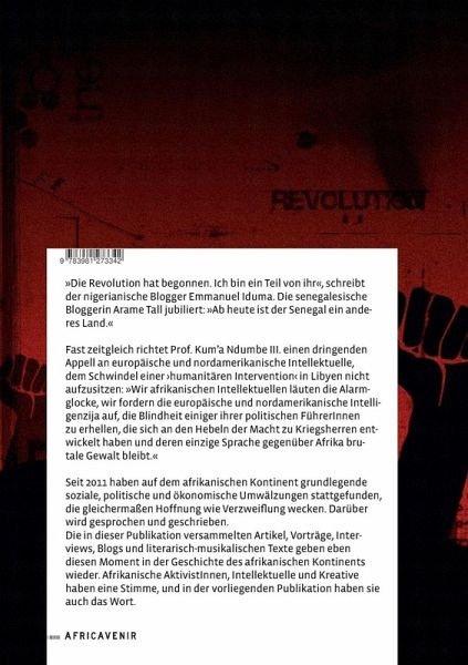 ¿Die Revolution hat begonnen. Ich bin ein Teil von ihr", schreibt der nigerianische Blogger Emmanuel Iduma. Die senegalesische Bloggerin Arame Tall jubiliert: ¿Ab heute ist der Senegal ein anderes Land.¿ Fast zeitgleich richtet Prof. Kum'a Ndumbe III. einen dringenden Appell an europäische und nordamerikanische Intellektuelle, dem Schwindel einer ¿humanitären Intervention" in Libyen nicht aufzusitzen: ¿Wir afrikanischen Intellektuellen läuten die Alarmglocke, wir fordern die europäische und nordamerikanische Intelligenzija auf, die Blindheit einiger ihrer politischen FührerInnen zu erhellen, die sich an den Hebeln der Macht zu Kriegsherren entwickelt haben und deren einzige Sprache gegenüber Afrika brutale Gewalt bleibt." Seit 2011 haben auf dem afrikanischen Kontinent grundlegende soziale, politische und ökonomische Umwälzungen stattgefunden, die gleichermaßen Hoffnung wie Verzweiflung wecken. Darüber wird gesprochen und geschrieben. Die in dieser Publikation versammelten Artikel, Vorträge, Interviews, Blogs und literarisch-musikalischen Texte geben eben diesen Moment in der Geschichte des afrikanischen Kontinents wieder. Afrikanische AktivistInnen, Intellektuelle und Kreative haben eine Stimme, und in dieser vorliegenden Publikation haben sie auch das Wort.