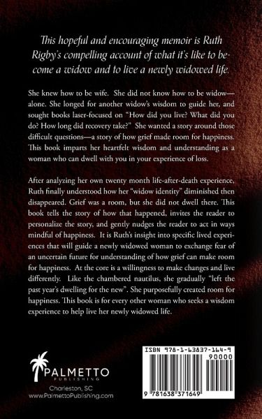 This hopeful and encouraging memoir is Ruth Rigby's compelling account of what it's like to become a widow and to live a newly widowed life. She knew how to be wife. She did not know how to be widow-alone. She longed for another widow's wisdom to guide her, and sought books laser-focused on "How did you live? What did you do? How long did recovery take?" She wanted a story around those difficult questions-a story of how grief made room for happiness. This book imparts her heartfelt wisdom and understanding as a woman who can dwell with you in your experience of loss. After analyzing her own twenty month life-after-death experience, Ruth finally understood how her "widow identity" diminished then disappeared. Grief was a room, but she did not dwell there. This book tells the story of how that happened, invites the reader to personalize the story, and gently nudges the reader to act in ways mindful of happiness. It is Ruth's insight into specific lived experiences that will guide a newly widowed woman to exchange fear of an uncertain future for understanding of how grief can make room for happiness. At the core is a willingness to make changes and live differently. Like the chambered nautilus, she gradually "left the past year's dwelling for the new". She purposefully created room for happiness. This book is for every other woman who seeks a wisdom experience to help live her newly widowed life