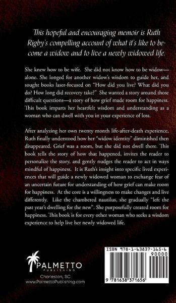 This hopeful and encouraging memoir is Ruth Rigby's compelling account of what it's like to become a widow and to live a newly widowed life. She knew how to be wife. She did not know how to be widow-alone. She longed for another widow's wisdom to guide her, and sought books laser-focused on "How did you live? What did you do? How long did recovery take?" She wanted a story around those difficult questions-a story of how grief made room for happiness. This book imparts her heartfelt wisdom and understanding as a woman who can dwell with you in your experience of loss. After analyzing her own twenty month life-after-death experience, Ruth finally understood how her "widow identity" diminished then disappeared. Grief was a room, but she did not dwell there. This book tells the story of how that happened, invites the reader to personalize the story, and gently nudges the reader to act in ways mindful of happiness. It is Ruth's insight into specific lived experiences that will guide a newly widowed woman to exchange fear of an uncertain future for understanding of how grief can make room for happiness. At the core is a willingness to make changes and to live differently. Like the chambered nautilus, she gradually "left the past year's dwelling for the new". She purposefully created room for happiness. This book is for every other woman who seeks a wisdom experience to help live her newly widowed life.