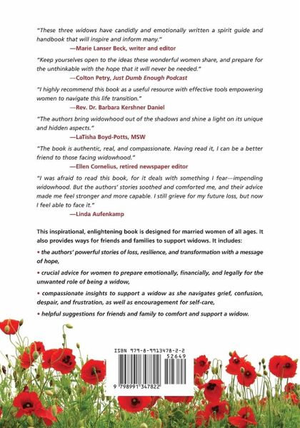 "These three widows have candidly and emotionally written a spirit guide and handbook that will inspire and inform many." -Marie Lanser Beck, writer and editor "Keep yourselves open to the ideas these wonderful women share, and prepare for the unthinkable with the hope that it will never be needed." -Colton Petry, Just Dumb Enough Podcast "I highly recommend this book as a useful resource with effective tools empowering women to navigate this life transition." -Rev. Dr. Barbara Kershner Daniel "The authors bring widowhood out of the shadows and shine a light on its unique and hidden aspects." -LaTisha Boyd-Potts, MSW "The book is authentic, real, and compassionate. Having read it, I can be a better friend to those facing widowhood." -Ellen Cornelius, retired newspaper editor "I was afraid to read this book, for it deals with something I fear - impending widowhood. But the authors' stories soothed and comforted me, and their advice made me feel stronger and more capable. I still grieve for my future loss, but now I feel able to face it." -Linda Aufenkamp This inspirational, enlightening book is designed for married women of all ages. It also provides ways for friends and families to support widows. It includes: the authors' powerful stories of loss, resilience, and transformation with a message of hope, crucial advice for women to prepare emotionally, financially, and legally for the unwanted role of being a widow, compassionate insights to support a widow as she navigates grief, confusion, despair, and frustration, as well as encouragement for self-care, helpful suggestions for friends and family to comfort and support a widow.