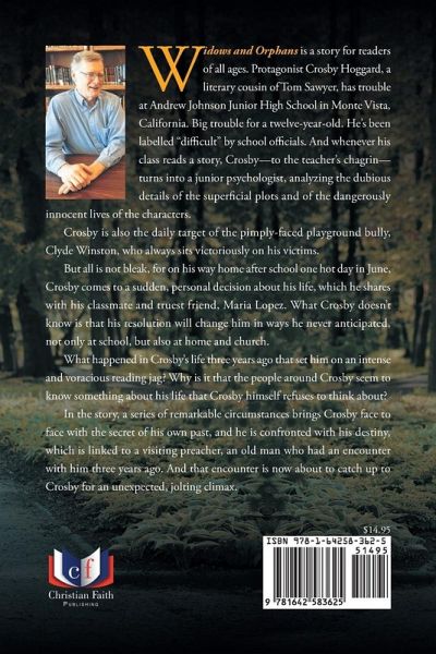 Widows and Orphans is a story for readers of all ages. Protagonist Crosby Hoggard, a literary cousin of Tom Sawyer, has trouble at Andrew Johnson Junior High School in Monte Vista, California. Big trouble for a twelve-year-old. He's been labelled "difficult" by school officials. And whenever his class reads a story, Crosby-to the teacher's chagrin-turns into a junior psychologist, analyzing the dubious details of the superficial plots and of the dangerously innocent lives of the characters. Crosby is also the daily target of the pimply-faced playground bully, Clyde Winston, who always sits victoriously on his victims. But all is not bleak, for on his way home after school one hot day in June, Crosby comes to a sudden, personal decision about his life, which he shares with his classmate and truest friend, Maria Lopez. What Crosby doesn't know is that his resolution will change him in ways he never anticipated, not only at school, but also at home and church. What happened in Crosby's life three years ago that set him on an intense and voracious reading jag? Why is it that the people around Crosby seem to know something about his life that Crosby himself refuses to think about? In the story, a series of remarkable circumstances brings Crosby face to face with the secret of his own past, and he is confronted with his destiny, which is linked to a visiting preacher, an old man who had an encounter with him three years ago. And that encounter is now about to catch up to Crosby for an unexpected, jolting climax.