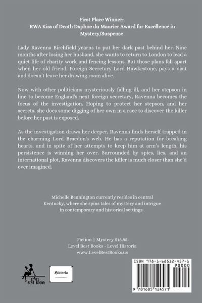Lady Ravenna Birchfield yearns to put her dark past behind her. Nine months after losing her husband, she wants to return to London to lead a quiet life of charity work and fencing lessons. But those plans fall apart when her old friend, Foreign Secretary Lord Hawkestone, pays a visit and doesn't leave her drawing room alive. Now with other politicians mysteriously falling ill, and her stepson in line to become England's next foreign secretary, Ravenna becomes the focus of the investigation. Hoping to protect her stepson, and her secrets, she does some digging of her own in a race to discover the killer before her past is exposed. As the investigation draws her deeper, Ravenna finds herself trapped in the charming Lord Braedon's web. He has a reputation for breaking hearts, and in spite of her attempts to keep him at arm's length, his persistence is winning her over. Surrounded by spies, lies, and an international plot, Ravenna discovers the killer is much closer than she'd ever imagined.