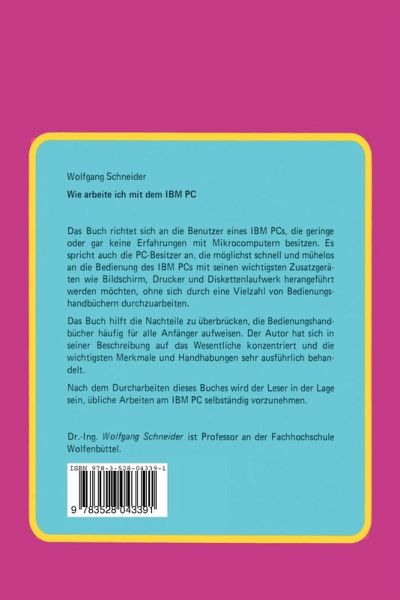1 Aufbau von Datenverarbeitungsanlagen.- 1.1 Allgemeines.- 1.2 Eingabeeinheiten.- 1.3 Speicher.- 1.4 Rechenwerk.- 1.5 Steuerwerk.- 1.6 Ausgabeeinheit.- 1.7 Struktur einer Datenverarbeitungsanlage.- 2 Überblick über die Hardwareausstattung des IBM PC.- 2.1 Zentraleinheit.- 2.2 Systemeinheit.- 2.3 Eingabetastatur.- 2.4 Bildschirm.- 2.5 Magnetbandkassettenrecorder.- 2.6 Diskettenlaufwerke (Floppy-Disk-Laufwerke).- 2.7 Festplatte.- 2.8 Drucker.- 2.9 Weitere Möglichkeiten.- 3 Installation und Test von Systemeinheit, Eingabetastatur und Bildschirm.- 3.1 Vorbereitung der Systemeinheit.- 3.2 Eingabetastatur an die Systemeinheit anschließen.- 3.3 Anschluß der Systemeinheit an das Stromnetz und Einschalttest.- 3.4 Anschluß des IBM-Schwarz-Weiß-Bildschirms (Monitor).- 3.5 Kontrolle der Schalterstellung auf der Systemplatine zur Anzahl der installierten Diskettenlaufwerke.- 3.6 Kontrolle der Schalterstellung auf der Systemplatine zum Arbeitsspeicherausbau.- 3.7 Einschalttest des Grundsystems.- 4 Allgemeiner Überblick über die Programmierung von Mikrocomputern.- 4.1 Allgemeines.- 4.2 Programmiersprachen.- 4.3 Übersetzerprogramme.- 5 Programmiersprachen des IBM PC.- 5.1 Standard-oder Kassetten-BASIC.- 5.2 Disketten-BASIC.- 5.3 Fortgeschrittenes BASIC - Advanced BASIC.- 5.4 Weitere Programmiersprachen.- 6 Allgemeiner Überblick über die Aufgaben von Betriebssystemen bei Mikrocomputern.- 6.1 Allgemeines.- 6.2 Elementare Aufgaben.- 6.3 Betriebssystemkommandos.- 6.4 Dialog zwischen Mikrocomputer und Mikrocomputerbenutzer.- 6.5 Speicherung von Betriebssystemen.- 7 Allgemeiner Überblick über das Betriebssystem des IBM PC.- 7.1 Betriebssystem für den Betrieb im Standard- bzw. Kassetten-BASIC.- 7.2 IBM-DOS-Betriebssystem.- 7.3 Wichtige Betriebssystemkommandos des IBM PCs.- 8Eingabe von BASIC-Programmen in den Arbeitsspeicher des IBM PCs.- 8.1 Eingabe einer Anweisung eines Programmes.- 8.2 Eingabe weiterer Anweisungen.- 8.3 Starten von BASIC-Programmen.- 8.4 Fehler im Programm.- 8.5 Neustart von BASIC-Programmen.- 9 Korrigieren von BASIC-Programmen.- 9.1 Korrigieren nicht abgeschlossener BAS IC-Anweisungen.- 9.2 Korrigieren von schon erstellten BASIC-Programmen.- 10 Inbetriebnahme des IBM-Grafikdruckers.- 10.1 Technische Daten.- 10.2 Anschluß des Druckers.- 10.3 Vorbereitungen am Drucker vor dem eigentlichen Drucken.- 10.4 Programmgesteuertes Drucken.- 11 Das Disketten-BASIC.- 11.1 Allgemeines.- 11.2 Erstellen einer landesspezifischen Systemdiskette.- 11.3 Formatieren neuer Disketten.- 11.4 Aufruf des Disketten-BASIC.- 11.5 Erstellen eines BASIC-Programmes mit Hilfe des Disketten-BASIC.- 11.6 Dateinamen.- 11.7 Speichern eines BASIC-Programms auf Diskette.- 11.8 Laden von BASIC-Programmen von der Diskette in den Arbeitsspeicher.- 11.9 Umbenennen von gespeicherten Dateien auf einer Diskette.- 11.10 Löschen von auf einer Diskette vorhandenen Dateien.- 11.11 Benutzung einer Programm-Diskette in Laufwerk B.- 11.12 Liste der Disketten-BASIC-Kommandos.- 12 Das DOS-Betriebssystem.- 12.1 Einführung in die wichtigsten DOS-Kommandos.- 12.2 Starten des DOS-Betriebssystems.- 12.3 Das DIR-Kommando.- 12.4 Das CHKDSK-Kommando.- 12.5 Das EDLIN-Kommando.- 12.6 Das COPY-Kommando.- 12.7 Das DISKCOPY-Kommando.- 12.8 Das SYS-Kommando.- 12.9 Das TYPE-Kommando.- 12.10 Ausdruck der Bildschirmausgabe.- 12.11 Das ERASE-oder DEL-Kommando.- 12.12 Das RENAME-Kommando.- 12.13 Erstellen von BASIC-Programmen mit Hilfe des Editors EDLIN und anschließender Programmstart.- 13 Anhang.- 13.1 Anhang A1 : Glossarium.- 13.2 Anhang A2: Der ASCII-Code.- 13.3 Anhang A3:Umwandlung von Zahlen.- 13.4 Anhang A4: Literaturverzeichnis.- Sachwortverzeichnis.