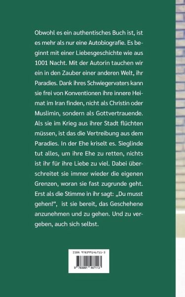 Obwohl es ein authentisches Buch ist, ist es mehr als nur eine Autobiografie. Es beginnt mit einer Liebesgeschichte wie aus 1001 Nacht. Mit der Autorin tauchen wir ein in den Zauber einer anderen Welt, ihr Paradies. Dank ihres Schwiegervaters kann sie frei von Konventionen ihre innere Heimat im Iran finden, nicht als Christin oder Muslimin, sondern als Gottvertrauende. Als sie im Krieg aus ihrer Stadt flüchten müssen, ist das die Vertreibung aus dem Paradies. In der Ehe kriselt es. Sieglinde tut alles, um ihre Ehe zu retten, nichts ist ihr für ihre Liebe zu viel. Dabei überschreitet sie immer wieder die eigenen Grenzen, woran sie fast zugrunde geht. Erst als die Stimme in ihr sagt: "Du musst gehen!", ist sie bereit, das Geschehene anzunehmen und zu gehen. Und zu vergeben, auch sich selbst.