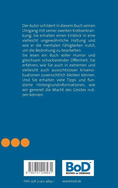 Der Autor schildert in diesem Buch seinen Umgang mit seiner zweiten Krebserkrankung. Sie erhalten einen Einblick in eine vielleicht ungewöhnliche Haltung und wie er die mentalen Fähigkeiten nutzt, um die Bedrohung zu bearbeiten. Sie lesen ein Buch voller Humor und gleichsam schockierender Offenheit. Sie erfahren, wie Sie auch in extremen und vielleicht auch aussichtslosen Krisensituationen zuversichtlich bleiben können. Und Sie erhalten viele Tipps und fundierte Hintergrundinformationen, wie wir generell die Macht des Geistes nutzen können.