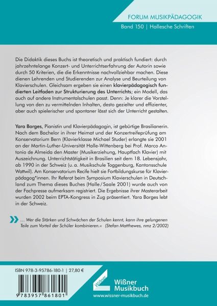 Die Didaktik dieses Buchs ist theoretisch und praktisch fundiert: durch jahrzehntelange Konzert- und Unterrichtserfahrung der Autorin sowie durch 50 Kriterien, die die Erkenntnisse nachvollziehbar machen. Diese dienen Lehrenden und Studierenden zur Analyse und Beurteilung von Klavierschulen. Gleichsam ergeben sie einen klavierpädagogisch fundierten Leitfaden zur Strukturierung des Unterrichts; ein Modell, das auch auf andere Instrumentalschulen passt. Denn: Je klarer die Vorstellung von den zu vermittelnden Inhalten, desto gezielter und effizienter, aber auch spielerischer und spontaner lässt sich der Unterricht gestalten.»... Wer die Stärken und Schwächen der Schulen kennt, kann ihre gelungenen Teile zum Vorteil der Schüler kombinieren.« (Stefan Matthewes, nmz 2/2002)