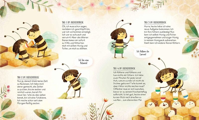 Auf einer Wiese am Waldrand lebt die Biene Matilda und lädt junge Naturfreund:innen ein, ihren Bienenstock zu erkunden. Zusammen entdeckt ihr die vielen, spannenden Aufgaben, die eine Biene im Laufe ihres Bienenlebens übernimmt, findet heraus, wie die sechseckigen Waben entstehen, und begebt euch auf Erkundungsflug, um Pollen und Nektar zu sammeln. Durch humorvolle Tagebucheinträge tauchen Kinder ab 6 Jahren in die emsige Welt der Bienen ein. Kurze, kindgerechte Texte und liebevolle Illustrationen vermitteln erstes Wissen über den Lebenszyklus und die wichtigen Aufgaben der Bienen.