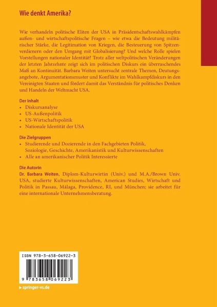 Wie verhandeln politische Eliten der USA in Präsidentschaftswahlkämpfen außen- und wirtschaftspolitische Fragen - wie etwa die Bedeutung militärischer Stärke, die Legitimation von Kriegen, die Besteuerung von Spitzenverdienern oder den Umgang mit Globalisierung? Und welche Rolle spielen Vorstellungen nationaler Identität? Trotz aller weltpolitischen Veränderungen der letzten Jahrzehnte zeigt sich im politischen Diskurs ein überraschendes Maß an Kontinuität. Barbara Weiten untersucht zentrale Themen, Deutungsangebote, Argumentationsmuster und Konflikte im Wahlkampfdiskurs in den Vereinigten Staaten und fördert damit das Verständnis für politisches Denken und Handeln der Weltmacht USA.