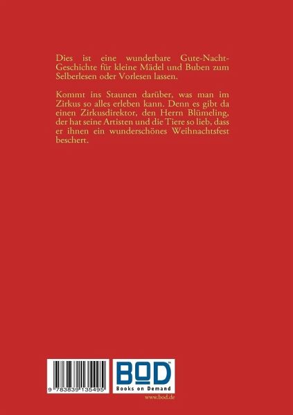 Dies ist eine wunderbare Gute-Nacht-Geschichte für kleine Mädel und Buben zum Selberlesen oder Vorlesen lassen.Kommt ins Staunen darüber, was man im Zirkus so alles erleben kann. Denn es gibt da einen Zirkusdirektor, den Herrn Blümeling, der hat seine Artisten und die Tiere so lieb, dass er ihnen ein wunderschönes Weihnachtsfest beschert.