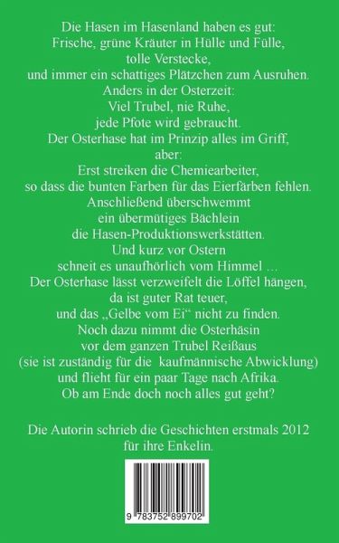 Die Hasen im Hasenland haben es gut: Frische, grüne Kräuter in Hülle und Fülle, tolle Versetcke, und immer ein schattiges Plätzchen zum Ausruhen. Anders in der Osterzeit: viel Trubel, nie Ruhe, jede Pfote wird gebraucht. Der Osterhase hat zwar im Prinzip alles im Griff, doch gibt es manchmal unerwartet Schwierigkeiten: Erst streiken die Chemiearbeiter, so dass die bunten Farben für das Eierfärben fehlen. Anschließend überschwemmt ein übermütiges Bächlein die Hasen-Produktionswerkstätten und kurz vor Ostern bedeckt eine dicke, weiße Schneedecke die grünen, blühenden Wiesen. Der Osterhase lässt verzweifelt die Löffel hängen, da ist "Guter Rat teuer" und "Das Gelbe vom Ei" nicht zu finden.Noch dazu nimmt die Osterhäsin vor dem ganzen Trubel Reißaus (sie ist zuständig für die kaufmännische Abwicklung) und flieht für ein paar Tage nach Afrika. Ob am Ende noch alles gut geht?Die Autorin schrieb die Geschichten erstmals 2012 für ihre Enkelin.