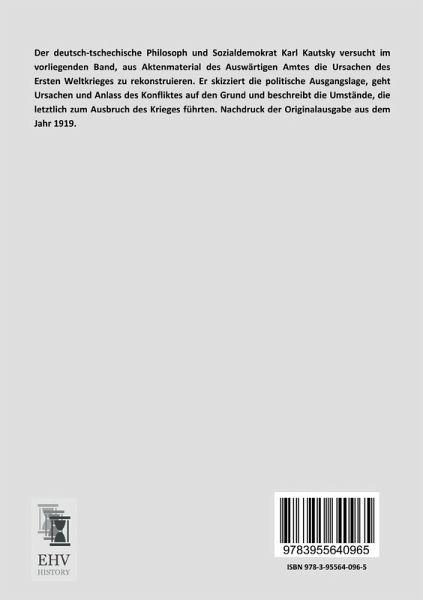 Der deutsch-tschechische Philosoph und Sozialdemokrat Karl Kautsky versucht im vorliegenden Band, aus Aktenmaterial des Auswärtigen Amtes die Ursachen des Ersten Weltkrieges zu rekonstruieren. Er skizziert die politische Ausgangslage, geht Ursachen und Anlass des Konfliktes auf den Grund und beschreibt die Umstände, die letztlich zum Ausbruch des Krieges führten. Nachdruck der Originalausgabe aus dem Jahr 1919.