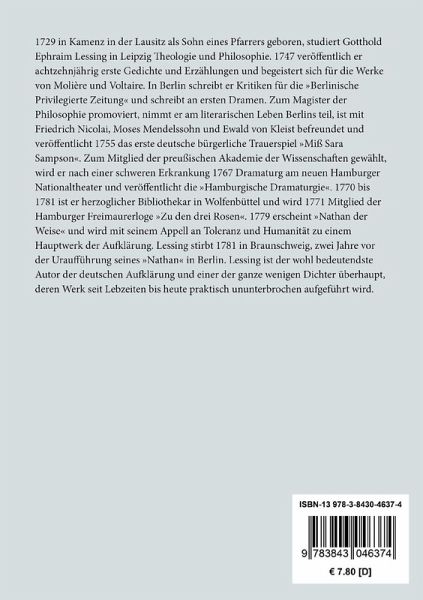 Gotthold Ephraim Lessing: Wie die Alten den Tod gebildet. Eine Untersuchung Erstdruck: Berlin (Voss) 1769. Vollständige Neuausgabe mit einer Biographie des Autors. Herausgegeben von Karl-Maria Guth. Berlin 2014. Textgrundlage ist die Ausgabe: Gotthold Ephraim Lessing: Werke. Herausgegeben von Herbert G. Göpfert in Zusammenarbeit mit Karl Eibl, Helmut Göbel, Karl S. Guthke, Gerd Hillen, Albert von Schirmding und Jörg Schönert, Band 1¿8, München: Hanser, 1970 ff. Die Paginierung obiger Ausgabe wird in dieser Neuausgabe als Marginalie zeilengenau mitgeführt. Umschlaggestaltung von Thomas Schultz-Overhage unter Verwendung des Bildes: Arnold Böcklin, Selbstbildnis mit fiedelndem Tod, 1872. Gesetzt aus Minion Pro, 11 pt. Über den Autor: 1729 in Kamenz in der Lausitz als Sohn eines Pfarrers geboren, studiert Gotthold Ephraim Lessing in Leipzig Theologie und Philosophie. 1747 veröffentlich er achtzehnjährig erste Gedichte und Erzählungen und begeistert sich für die Werke von Molière und Voltaire. In Berlin schreibt er Kritiken für die »Berlinische Privilegierte Zeitung« und schreibt an ersten Dramen. Zum Magister der Philosophie promoviert, nimmt er am literarischen Leben Berlins teil, ist mit Friedrich Nicolai, Moses Mendelssohn und Ewald von Kleist befreundet und veröffentlicht 1755 das erste deutsche bürgerliche Trauerspiel »Miß Sara Sampson«. Zum Mitglied der preußischen Akademie der Wissenschaften gewählt, wird er nach einer schweren Erkrankung 1767 Dramaturg am neuen Hamburger Nationaltheater und veröffentlicht die »Hamburgische Dramaturgie«. 1770 bis 1781 ist er herzoglicher Bibliothekar in Wolfenbüttel und wird 1771 Mitglied der Hamburger Freimaurerloge »Zu den drei Rosen«. 1779 erscheint »Nathan der Weise« und wird mit seinem Appell an Toleranz und Humanität zu einem Hauptwerk der Aufklärung. Lessing stirbt 1781 in Braunschweig, zwei Jahre vor der Uraufführung seines »Nathan« in Berlin. Lessing ist der wohl bedeutendste Autor der deutschen Aufklärung und einer der ganze wenigen Dichter überhaupt, deren Werk seit Lebzeiten bis heute praktisch ununterbrochen aufgeführt wird.