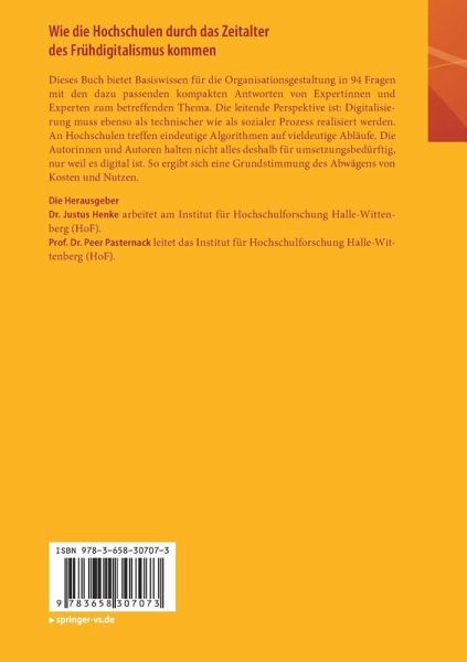 Dieses Buch bietet Basiswissen für die Organisationsgestaltung in 94 Fragen mit den dazu passenden kompakten Antworten von Expertinnen und Experten zum betreffenden Thema. Die leitende Perspektive ist: Digitalisierung muss ebenso als technischer wie als sozialer Prozess realisiert werden. An Hochschule treffen eindeutige Algorithmen auf vieldeutige Abläufe. Die Autoren und Autorinnen halten nicht alles deshalb für umsetzungsbedürftig, nur weil es digital ist. So ergibt sich eine Grundstimmung des Abwägens von Kosten und Nutzen.