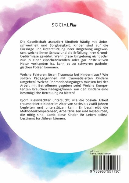 Die Gesellschaft assoziiert Kindheit häufig mit Unbeschwertheit und Sorglosigkeit. Kinder sind auf die Fürsorge und Unterstützung ihrer Umgebung angewiesen, welche ihnen Schutz und die Erfüllung ihrer Grundbedürfnisse gewährt. Wenn diese Umgebung nicht oder nur in einer einschränkenden oder gar destruktiven Natur vorhanden ist, kann es zu schweren pathologischen Folgen kommen. Welche Faktoren lösen Traumata bei Kindern aus? Wie sollten Pädagog/innen mit traumatisierten Kindern umgehen? Welche Rahmenbedingungen müssen bei der Arbeit mit Betroffenen gegeben sein? Welche Kompetenzen brauchen Pädagog/innen, um den Kindern eine bestmögliche Betreuung zu bieten? Björn Kleinwächter untersucht, wie die Soziale Arbeit traumatisierte Kinder im Alter von sechs bis zwölf Jahren begleiten und unterstützen kann. Er beschreibt die Methodenkompetenzen, Arbeitsweisen und Ressourcen, die nötig sind, damit diese Kinder ihr Leben selbstbestimmt fortführen können. Aus dem Inhalt: - Sozialpädagogik; - Bindungsverhalten; - Elternarbeit; - Netzwerkarbeit; - Resilienz; - Dissoziation; - Selbstbild