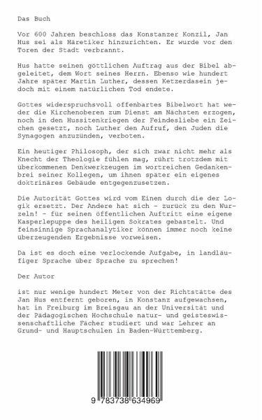 Vor 600 Jahren beschloss das Konstanzer Konzil, Jan Hus sei als Häretiker hinzurichten. Er wurde vor den Toren der Stadt verbrannt.Hus hatte seinen göttlichen Auftrag aus der Bibel abgeleitet, dem Wort seines Herrn. Ebenso wie hundert Jahre später Martin Luther, dessen Ketzerdasein jedoch mit einem natürlichen Tod endete.Gottes widerspruchsvoll offenbartes Bibelwort hat weder die Kirchenoberen zum Dienst am Nächsten erzogen, noch in den Hussitenkriegen der Feindesliebe ein Zeichen gesetzt, noch Luther den Aufruf, den Juden die Synagogen anzuzünden, verboten.Ein heutiger Philosoph, der sich zwar nicht mehr als Knecht der Theologie fühlen mag, rührt trotzdem mit überkommenen Denkwerkzeugen im wortreichen Gedankenbrei seiner Kollegen, um ihnen später ein eigenes doktrinäres Gebäude entgegenzusetzen.Die Autorität Gottes wird vom Einen durch die Logik ersetzt. Der Andere hat sich - zurück zu den Wurzeln! - für seinen öffentlichen Auftritt eine eigene Kasperlepuppe des heiligen Sokrates gebastelt. Und feinsinnige Sprachanalytiker können immer noch keine überzeugenden Ergebnisse vorweisen.Da ist es doch eine verlockende Aufgabe, in landläufiger Sprache über Sprache zu sprechen!