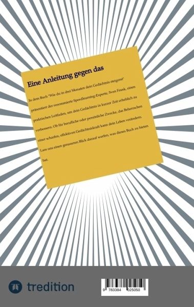 Das Buch beschreibt die wirksamsten Methoden und Techniken, um sich Daten, Zahlen, Fakten und Wissen jeder Art zu merken. Dazu gehören auch Vokabeln, Namen, Gesichter von Menschen und alles, was man sonst noch wissen sollte.