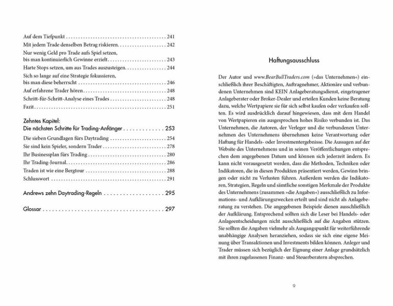Aller Anfang ist schwer - das gilt insbesondere für den professionellen Aktienhandel. Der erfahrene Profi-Trader Andrew Aziz nimmt seine Leser an die Hand und erklärt leicht verständlich und mit dem nötigen Fachwissen, was ein professioneller Daytrader für sein tägliches Geschäft benötigt und wie sich regelmäßige Gewinne erzielen lassen, um langfristig gut vom Traden zu leben. Aziz erklärt, welche Werkzeuge und Software benötigt werden, wie man den richtigen Broker findet und wie der typische Tagesablauf eines Traders aussieht. Der Leser lernt den Unterschied zwischen Day- und Swingtrading und zwischen selbstständigen und institutionellen Tradern kennen und wird in die wichtigen Grundlagen des Risikomanagements und der Tradingpsychologie eingeführt. Für Einsteiger und Fortgeschrittene gleichermaßen wertvoll ist ein umfassender Überblick über neun klassische Handelsstrategien, die mit nachweislichem Erfolg von zahlreichen Profis eingesetzt werden, und Tipps zum Erarbeiten der eigenen, ganz persönlichen Strategie. Ein modernes Standardwerk des Daytradings, das jeder, der in Zukunft seinen Lebensunterhalt mit Daytrading bestreiten möchte, unbedingt lesen sollte.