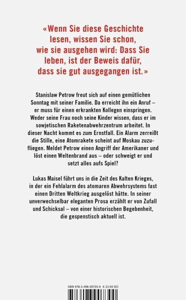 Lukas Maisel führt uns mit seinem neuen Roman in die Zeit des Kalten Krieges, in der ein Fehlalarm des atomaren Abwehrsystems fast einen Dritten Weltkrieg ausgelöst hätte. In seiner unverwechselbar eleganten Prosa erzählt er von Zufall und Schicksal - von einer historischen Begebenheit, die gespenstisch aktuell ist.