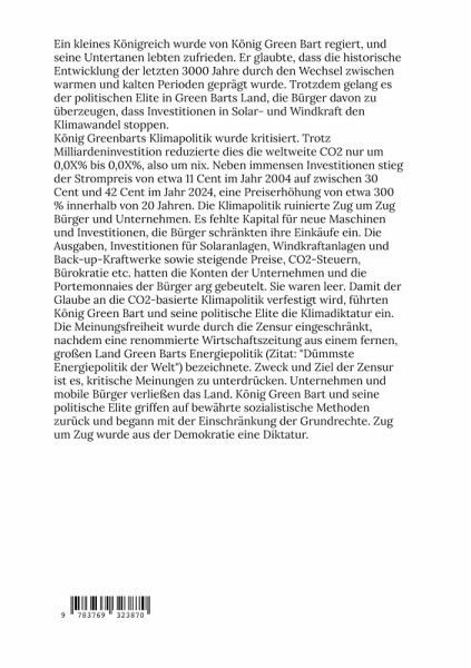 König Green Bart regierte ein kleines Königreich und seine Untertanen lebten zufrieden. Er glaubte, dass die historische Entwicklung der letzten 3000 Jahre durch den Wechsel zwischen warmen und kalten Perioden geprägt wurde. Der Klimawandel gehört zur Erdgeschichte wie die 4 Jahreszeiten. Trotzdem gelang es der politischen Elite in Green Barts Land, die Bürger davon zu überzeugen, dass Investitionen in Solar- und Windkraft den Klimawandel stoppen. Trotz Milliardeninvestition reduzierte dies die weltweite CO2 nur um 0,0X% bis 0,X%, also um nix. Neben immensen Investitionen stieg der Strompreis von etwa 11 Cent im Jahr 2004 auf zwischen 30 Cent und 42 Cent im Jahr 2024. Die Klimapolitik ruinierte Zug um Zug Bürger und Unternehmen. Es fehlte Kapital für neue Maschinen und Investitionen, die Bürger schränkten ihre Einkäufe ein. Die Ausgaben, Investitionen für Solaranlagen, Windkraftanlagen und Back-up-Kraftwerke sowie steigende Preise, CO2-Steuern, Bürokratie etc. hatten die Konten der Unternehmen und die Portemonnaies der Bürger arg gebeutelt. Sie waren leer. Damit der Glaube an die CO2-basierte Klimapolitik verfestigt wird, führten König Green Bart und seine politische Elite die Klimadiktatur ein. Die Meinungsfreiheit wurde durch die Zensur eingeschränkt, nachdem eine renommierte Wirtschaftszeitung aus einem fernen, großen Land Green Barts Energiepolitik (Zitat: "Dümmste Energiepolitik der Welt") bezeichnete. Zweck und Ziel der Zensur ist es, kritische Meinungen zu unterdrücken der Bürger zu unterdrücken. Unternehmen und mobile Bürger verließen das Land. König Green Bart und seine politische Elite griffen auf bewährte sozialistische Methoden zurück und begann mit der Einschränkung der Grundrechte. Zug um Zug wurde aus der Demokratie eine Klimadiktatur.