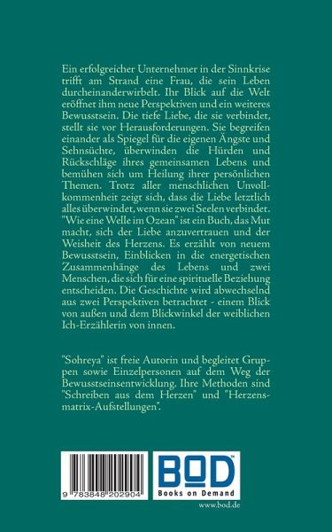 Ein erfolgreicher Unternehmer in der Sinnkrise trifft am Strand eine Frau, die sein Leben durcheinanderwirbelt. Ihr Blick auf die Welt eröffnet ihm neue Perspektiven und ein weiteres Bewusstsein. Die tiefe Liebe, die sie verbindet, stellt sie vor Herausforderungen. Sie begreifen einander als Spiegel für die eigenen Ängste und Sehnsüchte, überwinden die Hürden und Rückschläge ihres gemeinsamen Lebens und bemühen sich um Heilung ihrer persönlichen Themen. Trotz aller menschlichen Unvollkommenheit zeigt sich, dass die Liebe letztlich alles überwindet, wenn sie zwei Seelen verbindet."Wie eine Welle im Ozean" ist ein Buch, das Mut macht, sich der Liebe anzuvertrauen und der Weisheit des Herzens. Es erzählt von neuem Bewusstsein, Einblicken in die energetischen Zusammenhänge des Lebens und zwei Menschen, die sich für eine spirituelle Beziehung entscheiden. Die Geschichte wird abwechselnd aus zwei Perspektiven betrachtet - einem Blick von außen und dem Blickwinkel der weiblichen Ich-Erzählerin von innen.