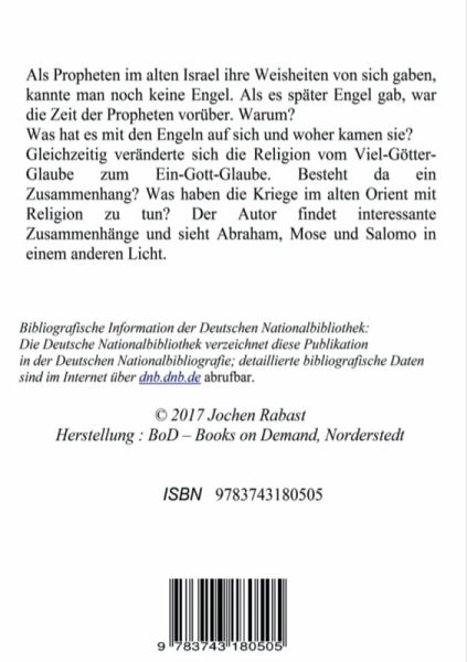 Als Propheten im alten Israel ihre Weisheiten von sich gaben, kannte man noch keine Engel. Als es später Engel gab, war die Zeit der Propheten vorüber. Warum? Was hat es mit den Engeln auf sich und woher kamen sie? Gleichzeitig veränderte sich die Religion vom Viel-Götter-Glaube zum Ein-Gott-Glaube. Besteht da ein Zusammenhang? Was haben die Kriege im alten Orient mit Religion zu tun? Der Autor findet interessante Zusammenhänge und sieht Abraham, Mose und Salomo in einem anderen Licht.