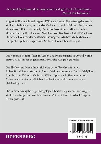 William Shakespeare: Wie es euch gefällt (As You Like It) Die Komödie in fünf Akten in Versen und Prosa entstand 1599 und wurde erstmals 1623 in der sogenannten First Folio Ausgabe gedruckt. Der Hofwelt entflohen findet sich eine bunte Gesellschaft in der Robin-Hood-Romantik des Ardenner Waldes zusammen. Das Waldidyll um Rosalind und Orlando, Celia und Oliver gipfelt nach Abenteuern und Maskeraden in einem fröhlichen Hochzeitsfest als Hymen vier Paare gleichzeitig traut. Die in dieser Ausgabe zugrunde gelegte Übersetzung stammt von August Wilhelm Schlegel und wurde erstmals 1799 bei Johann Friedrich Unger in Berlin gedruckt. Zur Schlegel-Tieck-Übersetzung: August Wilhelm Schlegel begann 1796 eine Gesamtübersetzung der Werke William Shakespeares, musste das Vorhaben jedoch 1810 nach 14 Dramen abbrechen. 1825 setzte Ludwig Tieck das Projekt unter Mitarbeit seiner ältesten Tochter Dorothea und Wolf Graf von Baudissins fort. 1833 schloss Dorothea Tieck mit der deutschen Fassung von Macbeth die bis heute als maßgeblich geltende sogenannte Schlegel-Tieck-Übersetzung ab. »Ich empfehle dringend die sogenannte Schlegel-Tieck-Übersetzung.« Marcel Reich-Ranicki Erstmals ins Deutsche übersetzt von Christoph Martin Wieland (1763). Die vorliegende Übersetzung stammt von August Wilhelm Schlegel. Erstdruck in: Shakspeare's dramatische Werke. Übersetzt von August Wilhelm Schlegel, Bd. 4, Berlin (Johann Friedrich Unger) 1799. Vollständige Neuausgabe. Herausgegeben von Karl-Maria Guth. Berlin 2015. Textgrundlage ist die Ausgabe: William Shakespeare: Sämtliche Werke in vier Bänden. Band 1, Herausgegeben von Anselm Schlösser. Berlin: Aufbau, 1975. Die Paginierung obiger Ausgabe wird in dieser Neuausgabe als Marginalie zeilengenau mitgeführt. Umschlaggestaltung von Thomas Schultz-Overhage unter Verwendung des Bildes: Willi, Tim Tempelhofer, 2015. Gesetzt aus Minion Pro, 11 pt.