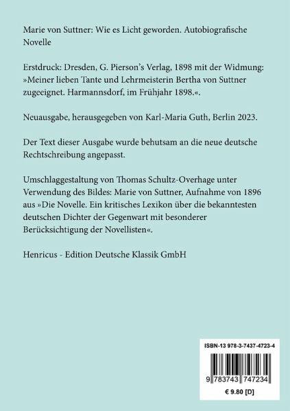Marie von Suttner: Wie es Licht geworden. Autobiografische NovelleErstdruck: Dresden, G. Pierson's Verlag, 1898 mit der Widmung: »Meiner lieben Tante und Lehrmeisterin Bertha von Suttner zugeeignet. Harmannsdorf, im Frühjahr 1898.«.Neuausgabe, herausgegeben von Karl-Maria Guth, Berlin 2023.Der Text dieser Ausgabe wurde behutsam an die neue deutsche Rechtschreibung angepasst.Umschlagabbildung: Marie von Suttner, Aufnahme von 1896 aus »Die Novelle. Ein kritisches Lexikon über die bekanntesten deutschen Dichter der Gegenwart mit besonderer Berücksichtigung der Novellisten«Gesetzt aus der Minion Pro, 11 pt.Die Sammlung Hofenberg erscheint im Verlag Henricus - Edition Deutsche Klassik GmbH, Berlin