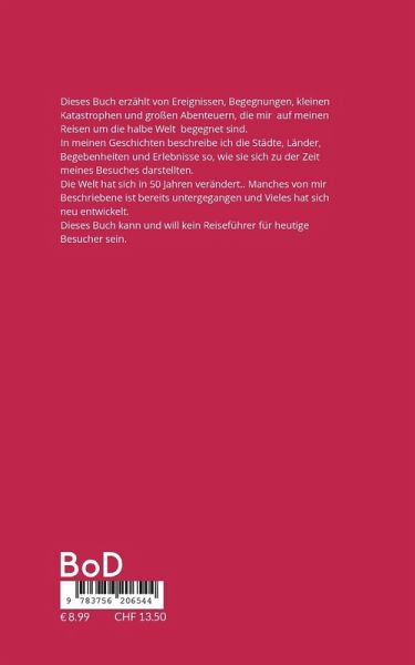 Dieses Buch erzählt von Ereignissen, Begegnungen, kleinen Katastrophen und großen Abenteuern, die mir auf meinen Reisen um die halbe Welt begegnet sind. In meinen Geschichten beschreibe ich die Städte, Länder, Begebenheiten und Erlebnisse so, wie sie sich zu der Zeit meines Besuches darstellten. Die Welt hat sich in 50 Jahren verändert.. Manches von mir Beschriebene ist bereits untergegangen und Vieles hat sich neu entwickelt.Dieses Buch kann und will kein Reiseführer für heutige Besucher sein.