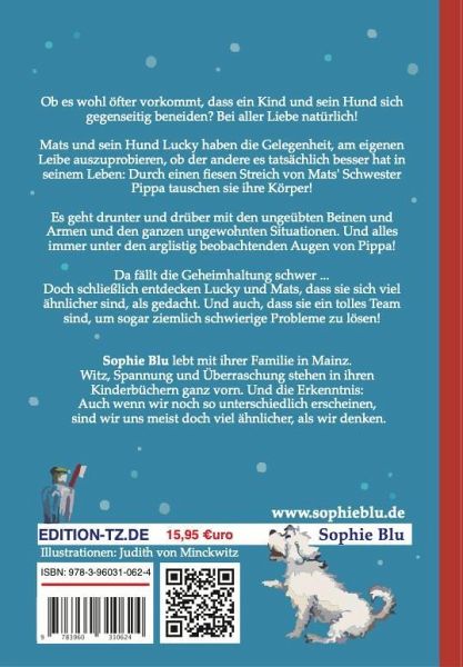 Ob es wohl öfter vorkommt, dass ein Kind und sein Hund sich gegenseitig beneiden? Bei aller Liebe natürlich! Mats und sein Hund Lucky haben die Gelegenheit, am eigenen Leibe auszuprobieren, ob der andere es tatsächlich besser hat in seinem Leben: Durch einen fiesen Streich von Mats' Schwester Pippa tauschen sie ihre Körper! Es geht drunter und drüber mit den ungeübten Beinen und Armen und den ganzen ungewohnten Situationen. Und alles immer unter den arglistig beobachtenden Augen von Pippa! Da fällt die Geheimhaltung schwer... Doch schließlich entdecken Lucky und Mats, dass sie sich viel ähnlicher sind, als gedacht. Und auch, dass sie ein tolles Team sind, um sogar ziemlich schwierige Probleme zu lösen!