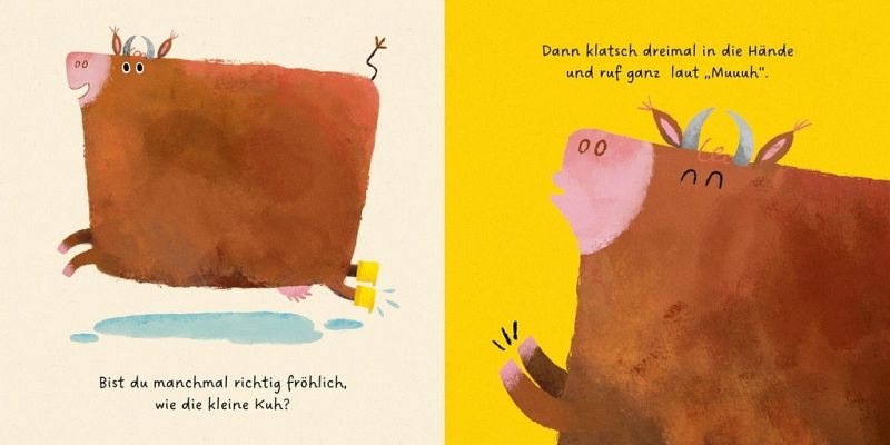 Bist du manchmal richtig fröhlich, wie die kleine Kuh? Dann klatsch dreimal in die Hände und ruf ganz laut "Muuuh"! In diesem lustigen Mitmachbuch lernen Kinder ab 2 Jahren spielerisch ihre Gefühle zu benennen. Niedliche Tierreime laden zum Mitklatschen und Mitsprechen ein und fördern ganz nebenbei Motorik und Sprachentwicklung. Die tierisch süßen Illustrationen von Anna Süßbauer lassen die Bauernhoftiere lebendig werden und sorgen für einen unterhaltsamen Vorlesespaß. Ein einzigartiges Bilderbuch über Gefühle, das Mamas und Papas einen interaktiven Zugang zur Gefühlswelt ihrer Kinder bietet.