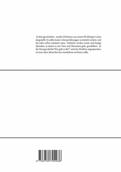 In Kurzgeschichten werden Erlebnisse aus einem 80-Jährigem Leben dargestellt. Es sollen keine Lebenserfahrungen vermittelt werden, weil die jeder selbst sammeln muss. Vielmehr werden lustige und ernste Episoden, in denen es um Tiere und Menschen geht, geschildert. In der Kurzgeschichte "Wie geht es dir?" wird auch das Problem angesprochen, ob man alten Menschen das Autofahren verbieten sollte.