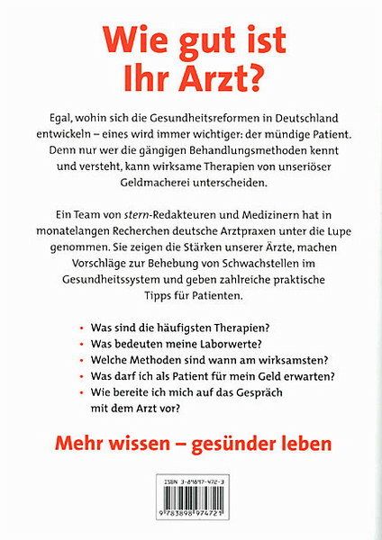 Egal, wohin sich die Gesundheitsreformen in Deutschland entwickeln - eines wird immer wichtiger: der mündige Patient. Denn nur wer die gängigen Behandlungsmethoden kennt und versteht, kann wirksame Therapien von unseriöser Geldmacherei unterscheiden. Ein Team von "Stern"-Redakteuren und Medizinern hat deutsche Arztpraxen unter die Lupe genommen. Sie zeigen die Stärken und Schwächen unserer Ärzte und unseres Gesundheitssystems und geben zahlreiche praktische Tipps für Patienten.