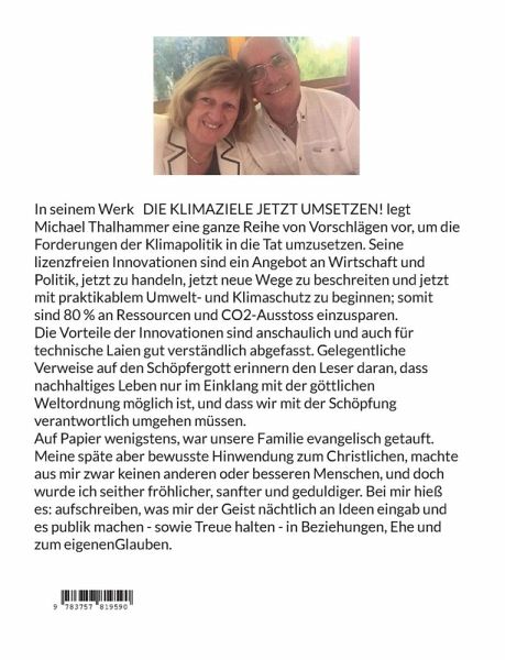 Wie heraus aus der Klimafalle? In seinem Werk » DIE KLIMAZIELE JETZT UMSETZEN ! « legt Michael Thalhammer eine ganze Reihe von Vorschlägen vor, um die Forderungen der Klimapolitik in die Tat umzusetzen. Seine lizenzfreien Innovationen sind ein Angebot an Wirtschaft und Politik, jetzt zu handeln, jetzt neue Wege zu beschreiten und jetzt mit praktikablem Umwelt- und Klimaschutz zu beginnen; somit sind 80 % an Ressourcen und CO2-Ausstoss einzusparen.Die Vorteile der Innovationen sind anschaulich und auch für technische Laien gut verständlich abgefasst. Gelegentliche Verweise auf den Schöpfergott erinnern den Leser daran, dass nachhaltiges Leben nur im Einklang mit der göttlichen Weltordnung möglich ist, und dass wir mit der Schöpfung verantwortlich umgehen müssen.