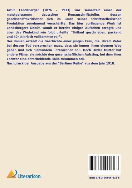 Artur Landsberger (1876 - 1933) war seinerzeit einer der meistgelesenen deutschen Romanschriftsteller, dessen gesellschaftskritischer sich im Laufe seiner schriftstellerischen Produktion zunehmend verschärfte. Das hier vorliegende Werk ist Landsbergers Debüt, womit er bereits einiges Aufsehen erregte und über das Wedekind wie folgt urteilte: "Brillant geschrieben, packend und künstlerisch vollkommen reif". Der Roman erzählt die Geschichte einer jungen Frau, die ihrem Vater bei dessen Tod versprechen muss, dass sie immer ihren eigenen Weg gehen und sich niemandem unterordnen soll. Doch Hildes Mutter hat andere Pläne, sie möchte den gesellschaftlichen Aufstieg, bei dem ihrer Tochter eine entscheidende Rolle zukommen soll. Nachdruck der Ausgabe aus der "Berliner Reihe" aus dem Jahr 1918.